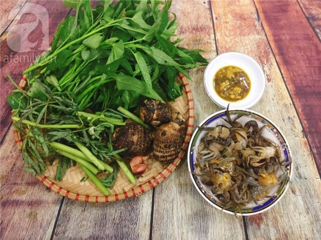 canh cua nấu khoai sọ, rau muống, rau rút tuy chế biến có hơi cầu kì