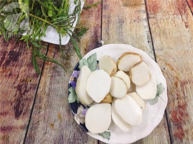 Khoai sọ gọt vỏ, rửa sạch bổ đôi, đeo bao tay bóp kỹ với muối cho khỏi ngứa và nhớt. rau muống, rau rút nhặt bỏ phần già, rửa sạch để ráo. Hành khô bóc vỏ thái mỏng.