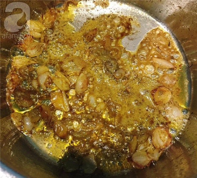 Trong lúc chờ khoai sọ chín, bắc một chảo nhỏ lên bếp, đun nóng 3 thìa dầu ăn, phi thơm hành khô, cho gạch cua vào đảo đều để lấy màu rồi cho vào nồi canh cua đang ninh.