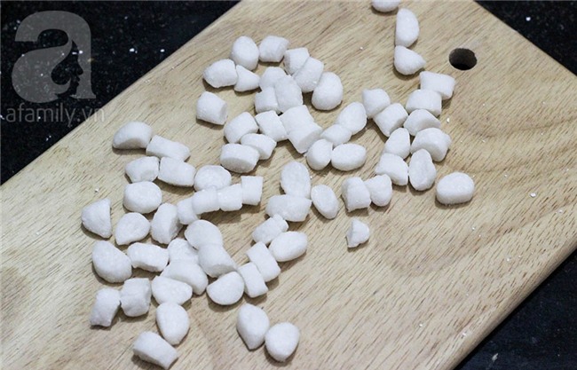 Nặn bột năng thành từng dải bột dài, dùng dao cắt dải bột năng thành từng viên trân châu nhỏ.
