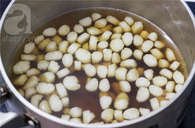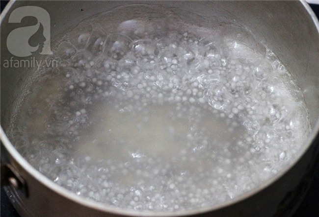 Đổ nước cùng đường nâu vào nồi đun sôi, đổ trân châu vào nồi đun đến khi trân châu nổi lên mặt nước.