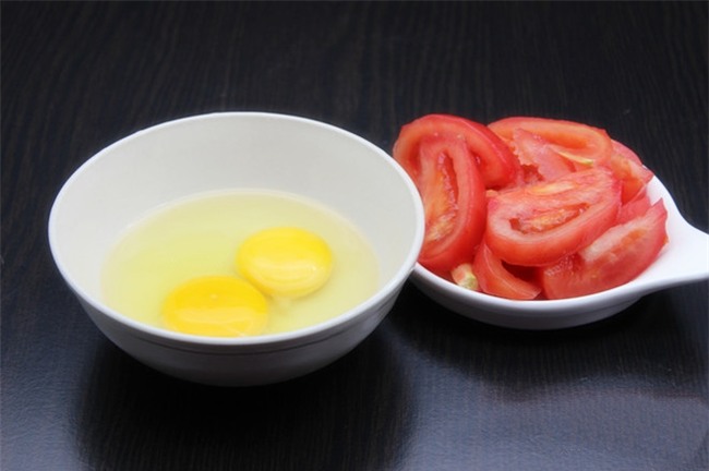 Cà chua rửa sạch lột vỏ, thái lát, trộn cà chua với đường. Trứng đập vào bát đánh tan.