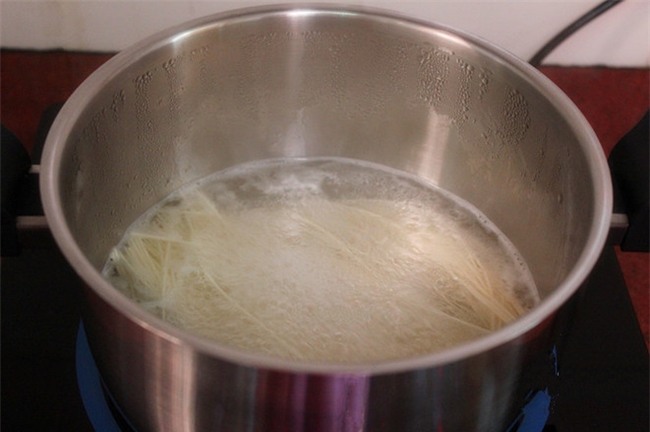Đun sôi một nồi nước, cho mì vào nấu chín rồi vớt ra xả với nước lạnh cho tơi.