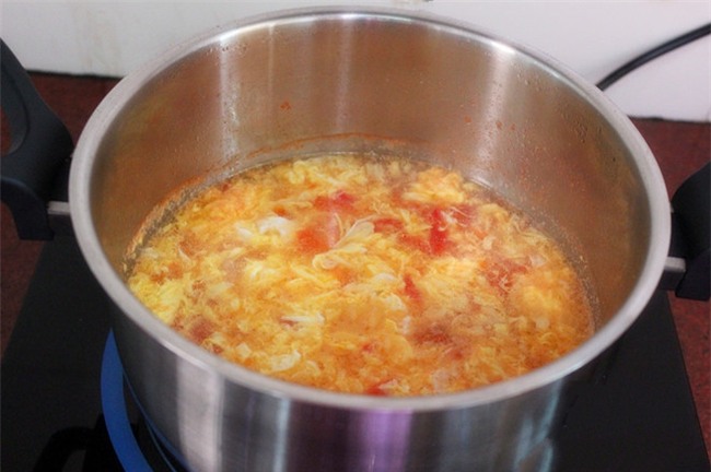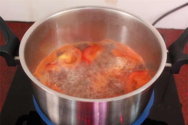 Cho lượng nước vừa ăn vào đun sôi, cho cà chua thái lát vào.