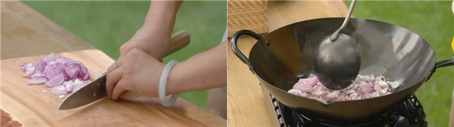 Hành tây bóc vỏ thái lát. Đun nóng dầu ăn trong chảo, đổ hành tây vào phi.