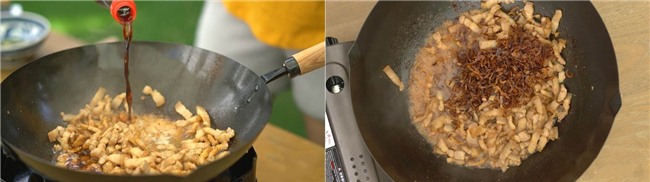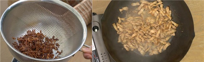 Khi hành chín vàng thì vớt ra để ráo dầu. Đổ phần dầu chiên hành ra bát chỉ giữ lại một ít trong chảo. Thêm thịt đã ướp vào đảo đều.