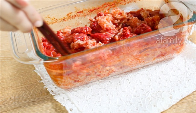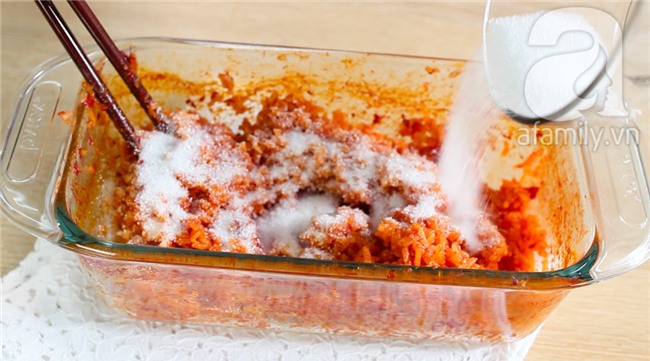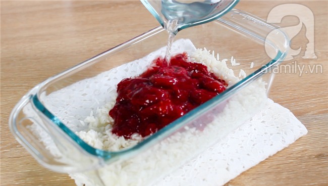 Cho gạo nếp vào thố, cho muối, gấc, nước và nước cốt dừa vào trộn đều.