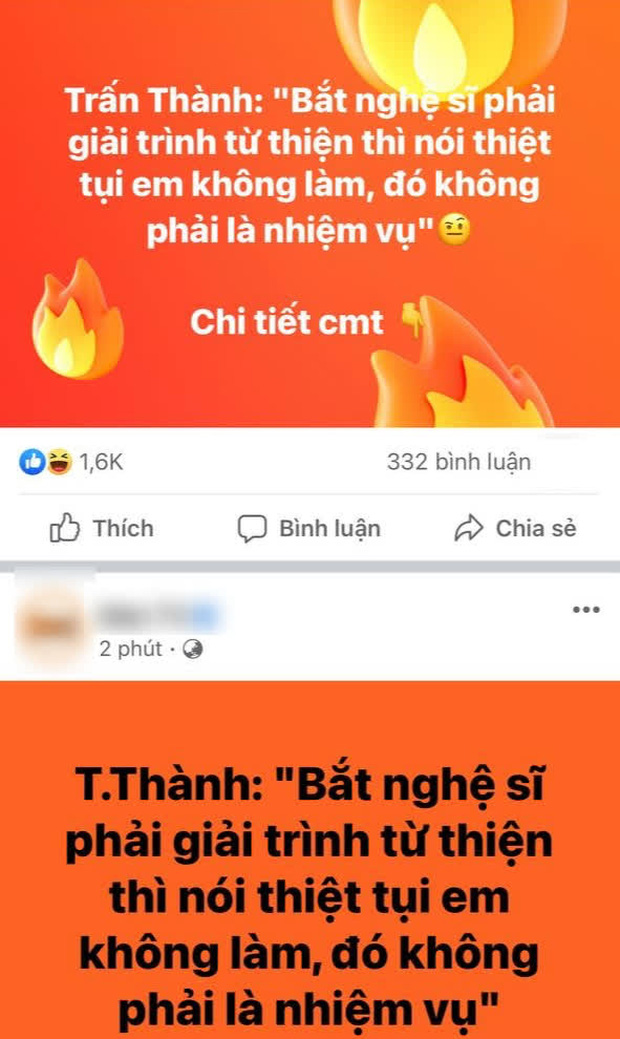 Loạt fanpage lớn nhỏ chia sẻ lại phát ngôn của Trấn Thành nhưng không đầy đủ khiến netizen thêm tranh cãi