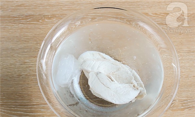 Luộc chín thịt gà với hành tím cho thơm. Vớt thịt ra tô nước lạnh cho nguội và thịt không bị khô.