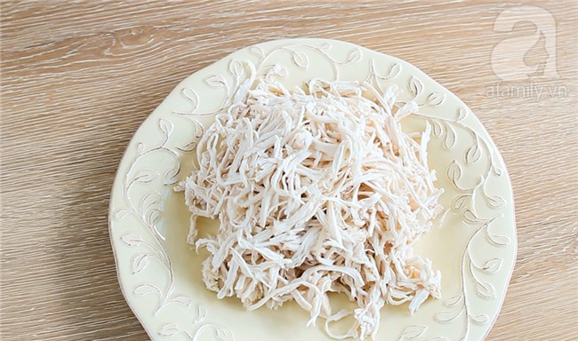 Xé thịt ra để ráo và xé sợi. Bỏ đi phần mỡ gà, vì mỡ sẽ làm cho khô gà mau hỏng.
