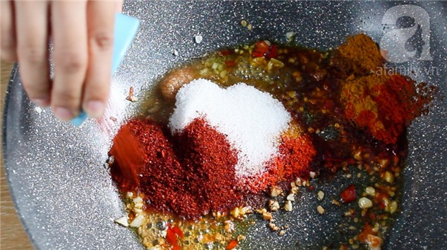 Để lửa vừa, cho tiếp các gia vị vào: bột điều, bột cà-ri, bột ngũ vị hương, bột ớt đường, muối, mì chính, nước mắm vào.