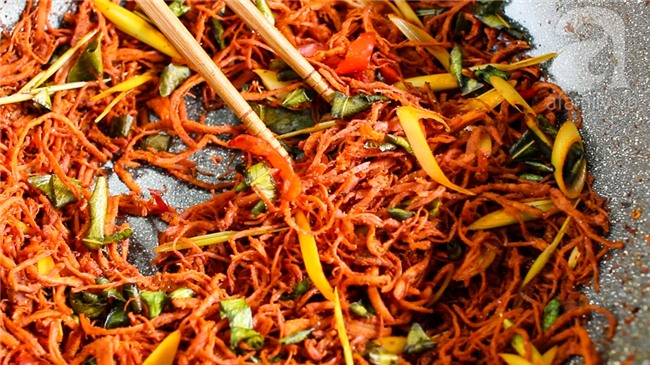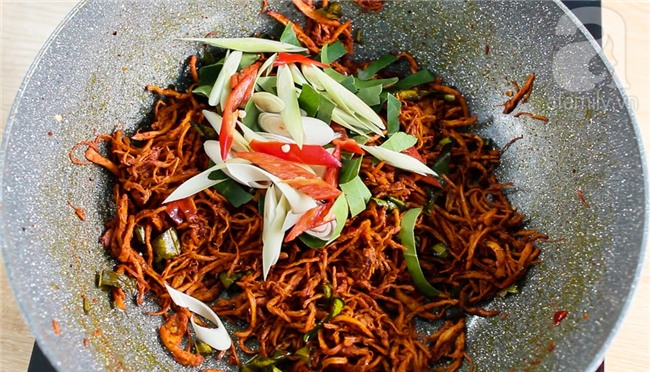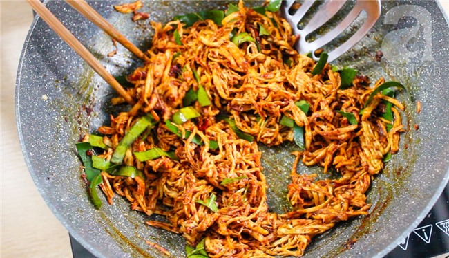 Hạ lửa nhỏ, xới đều cho gà thấm gia vị. Dùng 2 chiếc đũa đảo đề sợi thịt gà được tơi ra.