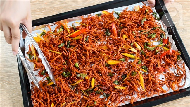 Hoặc sấy bằng lò nướng. Cho gà ra khay, rải đều ra. Cho vào lò sấy ở 150 độ C trong 3-4 phút/lần. Lấy ra đảo đều rồi lại cho vào lò sấy. Thực hiện công đoạn sấy từ 2-3 lần cho thịt gà khô hoàn toàn.