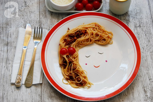Cách trình bày món mì thành khuôn mặt bé gái tóc dài: