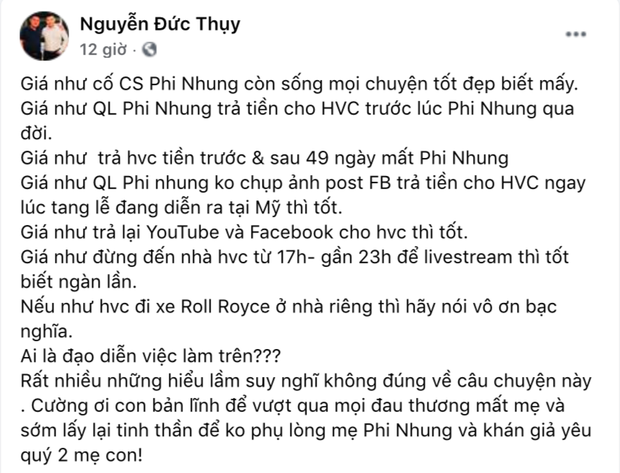 Giữa lúc cư dân mạng còn đang "khẩu chiến" nảy lửa, bầu Thuỵ bất ngờ đăng nêu ra 7 điều "giá như" trong lùm xùm của mẹ con ca sĩ Phi Nhung. Theo lời người này, ekip của cố ca sĩ Phi Nhung đã có những cách xử lý không hợp thời gian và không gian dẫn đến sự việc càng thêm ồn ào, phức tạp hơn. Nói về Hồ Văn Cường, vị bầu show này chốt hạ 1 câu: "Nếu như Hồ Văn Cường đi xe Rolls Royce ở nhà riêng thì hãy nói vô ơn bạc nghĩa. Ai là đạo diễn việc làm trên. Rất nhiều những hiểu lầm suy nghĩ không đúng về câu chuyện này".