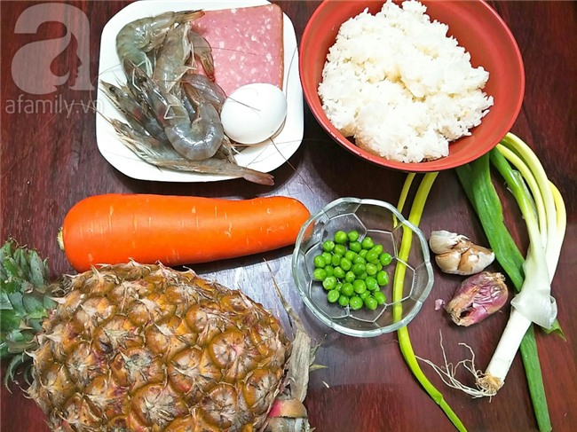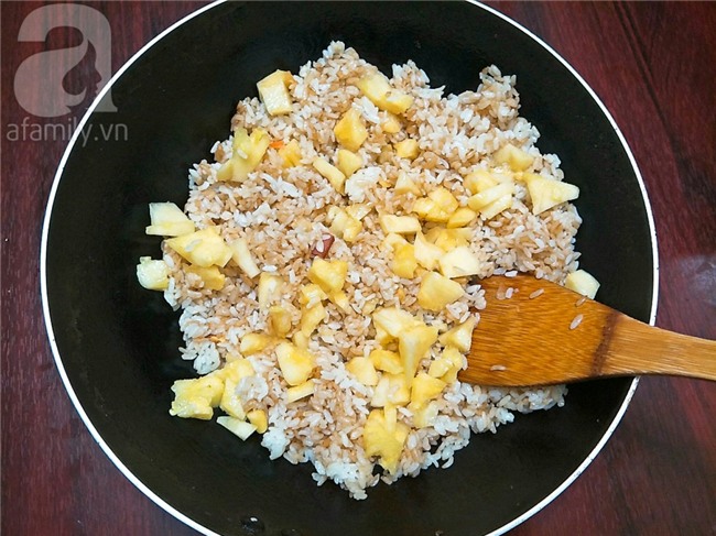 Vẫn sử dụng cái chảo ấy, cho thêm chút dầu ăn vào đun nóng dầu, cho hành tỏi băm vào phi thơm sau đó cho cơm vào chiên, đảo vài vòng rồi cho nước tương, bột nêm và đảo cho cơm tơi ra, chiên thêm vài phút cho hạt cơm săn lại thì cho dứa thái nhỏ vào.