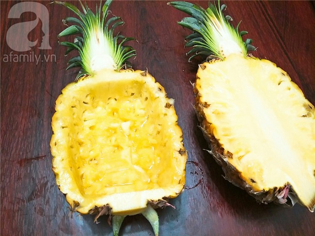 Dứa bổ làm đôi, 1 nửa quả dứa sẽ làm bát để đựng cơm sau khi chiên sau đó dùng dao nhọn khoét phần thịt dứa và thái vừa nhỏ để ra đĩa.