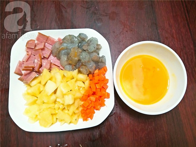 Tôm lột vỏ, lấy chỉ đen và thái nhỏ, giăm bông thái hình vuông nhỏ, trứng gà cho vào bát đánh tan, cà rốt thái hạt lựu, tỏi băm nhỏ, hành lá thái nhỏ.