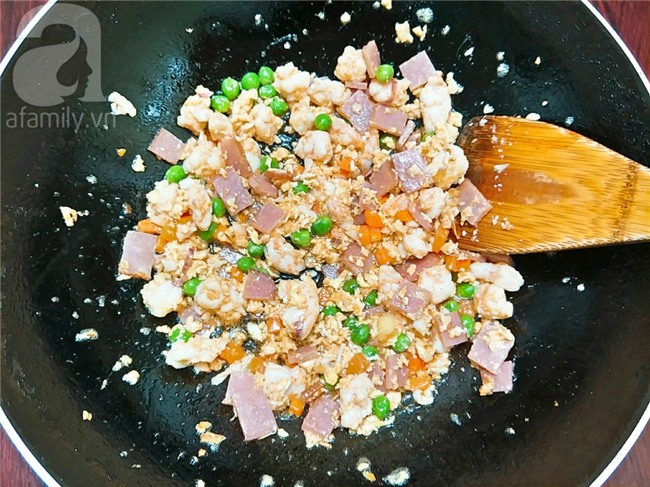 Cho chảo lên bếp cùng với 1 thìa dầu ăn, đun nóng dầu thì cho 1/2 chỗ hành tỏi băm vào phi thơm sau đó cho cà rốt, giăm bông, tôm, đậu Hà Lan vào xào cho thơm rồi nêm chút bột nêm, xíu muối, tiêu đảo đều, xào cho các nguyên liệu chín thì cho trứng gà vào đảo đều cho trứng chín là xúc ra đĩa.