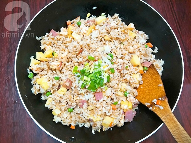 Trút toàn bộ phần nhân đã xào chín vào chảo cơm, đảo đều và nếm lại cho vừa miệng rồi thêm hành lá vào là tắt bếp.
