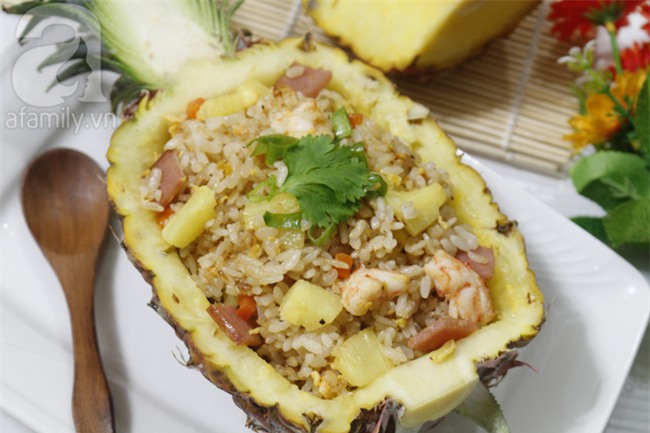 Xúc cơm chiên dứa vào 1 nửa quả dứa đã khoét sẵn khi nãy rồi thưởng thức.