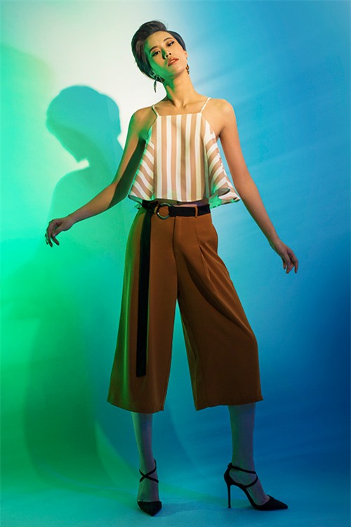 Thuỳ Trang phiêu lãng bằng kết hợp áo lệch vai và quần gập ly bay bổng.