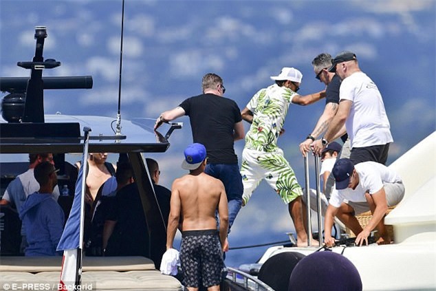 | Neymar vui đùa cùng những bạn thân dưới thời tiết nắng đẹp tại St Tropez. Tiền đạo người Brazil đứng trên du thuyền hạng sang trong chuyến đi chơi. |