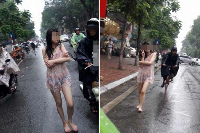 Trưa ngày 24/5, rất nhiều người đi đường đã không khỏi giật mình khi thấy hình ảnh một cô gái trẻ đi bộ dọc đường Nguyễn Thái Học (Hà Nội) giữa trời mưa to. Không những thế, cô gái này còn diện trang phục khá mỏng, đi chân đất và không che ô, hay mặc áo mưa.