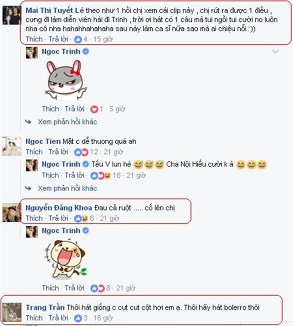 "Theo như một hồi chị xem cái clip này, chị rút ra được một điều em đi làm diễn viên hài đi Trinh. Trời ơi hát có một câu mà tôi ngồi tôi cười no luôn nha cô. Sau này đi làm ca sĩ nữa sao mà ai chịu nổi" - Facebooker Mai Thị Tuyết Lê chia sẻ.