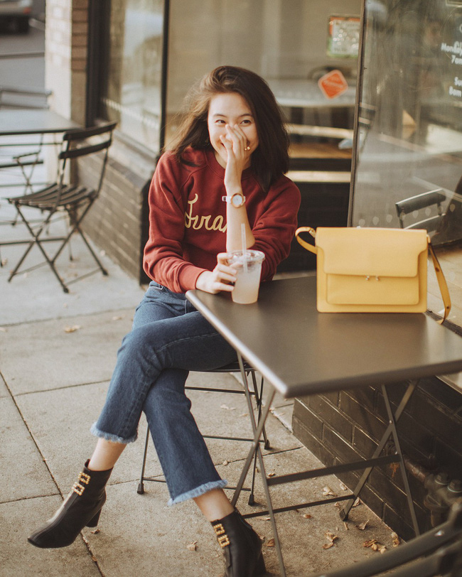 Sự xuất hiện của chiếc quần jeans xắn gấu cùng đôi boots đen đơn giản nhưng sành điệu, khỏe khoắn trong set đồ này quả thực là không thể thay thế.