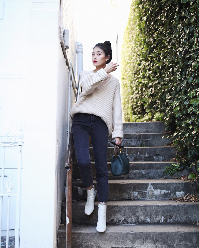 Nửa kia hoàn hảo của những chiếc áo len/áo thun và áo khoác “độc quyền” của mùa đông không gì khác chính là quần jeans + boots thấp cổ.