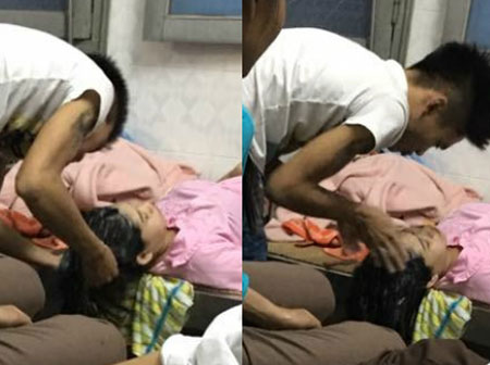 Đoạn clip được đăng tải trên mạng xã hội với tiêu đề dễ thương như sau: "Tại một bệnh viện đa khoa, vào buổi chiều qua ,các chị em phụ nữ ở khoa phụ sản xuýt xoa khi chứng kiến cảnh người chồng rất trẻ tầm 9x đang đứng lom khom ,bằng đôi bàn tay khéo léo kiên nhẫn gội đầu, xoa bóp cho vợ sắp đẻ ngay ở giường bệnh".
