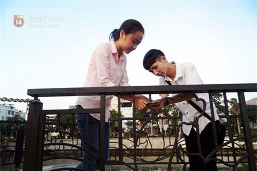 Đôi bạn trẻ đang treo ổ khóa của mình lên cầu tình yêu |