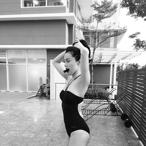 Bộ đồ bơi liền thân khiến vòng eo săn chắc cùng vòng 1 nở nang của Diệp Lâm Anh được tôn lên tối đa