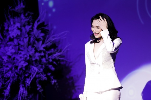 Bộ suite trắng cách điệu ở góc chụp tổng thể. Chiếc áo được thiết kế mềm mại hơn với phần lai nhún nhẹ, một bên thân áo được đính đá nhằm tạo điểm nhất duyên dáng cho set đồ mà vẫn không khiến Mỹ Tâm bị trở nên diêm dúa.