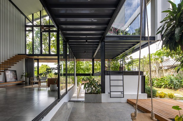Khi đến gần ngôi nhà, ta có cảm giác được hòa mình vào thiên nhiên nhiệt đới nhờ mặt tiền và hành lang xanh.