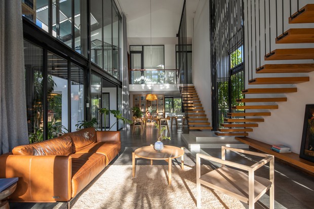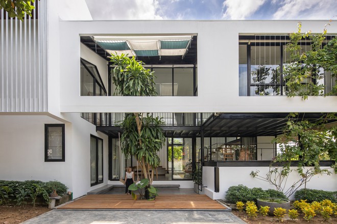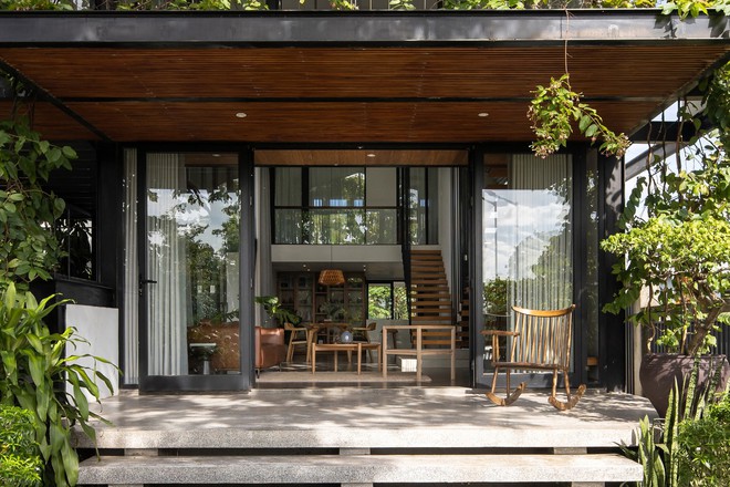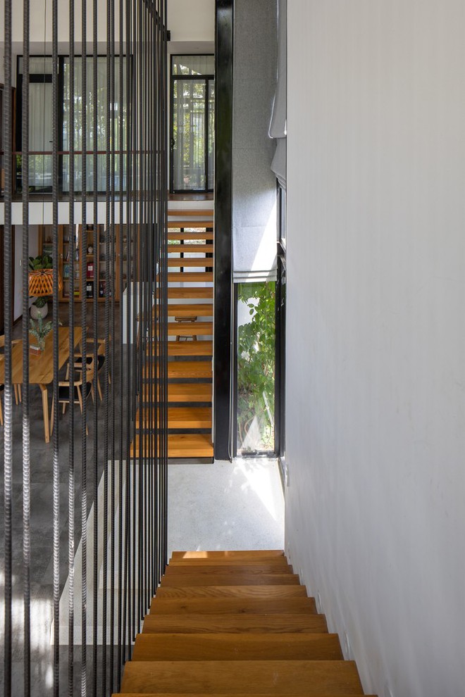 Khu vực bóng mát giữa tầng 2 và tầng lửng đóng vai trò như một vùng đệm không khí, giúp ngôi nhà được