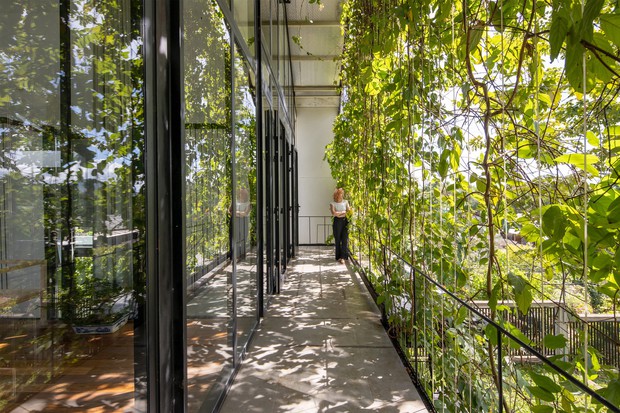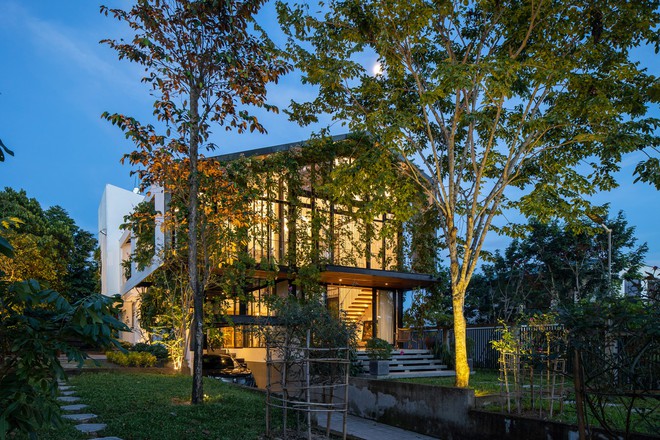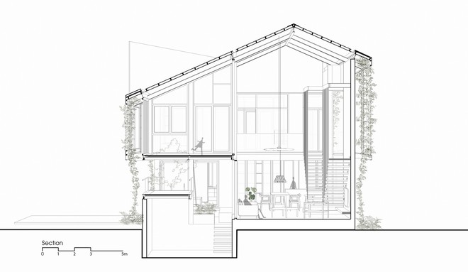 Mặt đứng với hệ thống dây leo xanh dọc theo mái nhà, hành lang và ban công giúp điều tiết ánh nắng trực tiếp chiếu vào đồng thời cho phép các vệt nắng chiếu vào khoảng trống một cách hiệu quả và mang lại sự riêng tư cho khu vực bên trong.