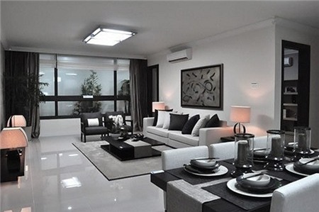 Phòng khách với nội thất hiện đại, tông màu xám trắng.