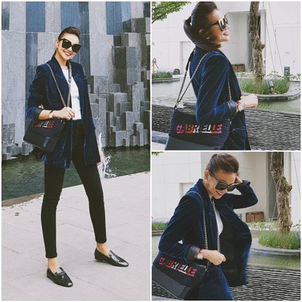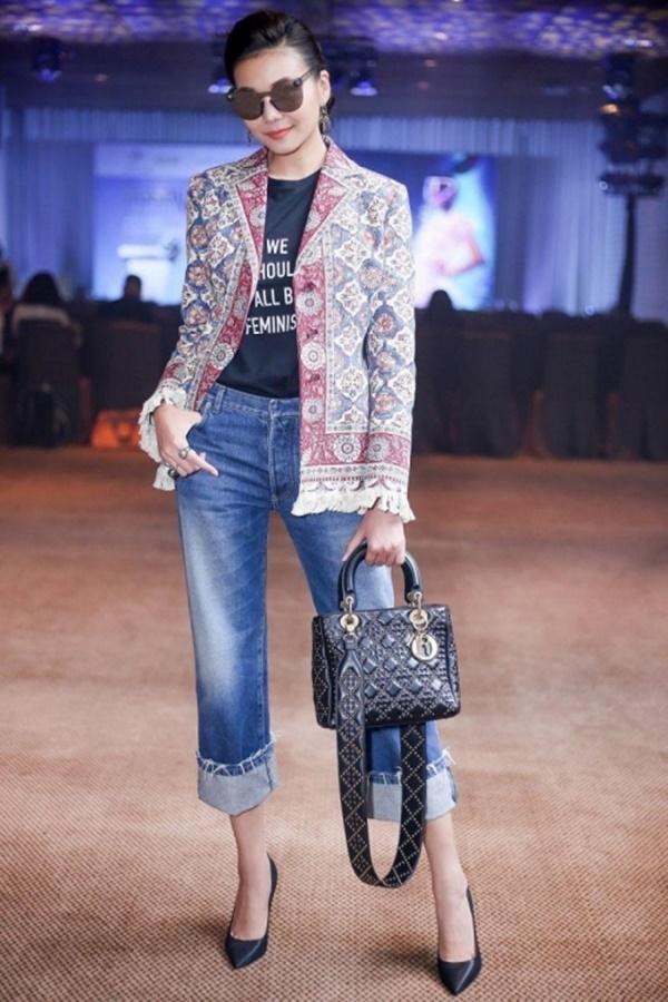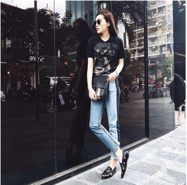 Thanh Hằng là tín đồ trung thành của phong cách menswear. Chỉ cần áo thun, quần jean phối cùng túi xách cũng đủ tạo nên nét quyến rũ đặc trưng của Thanh Hằng