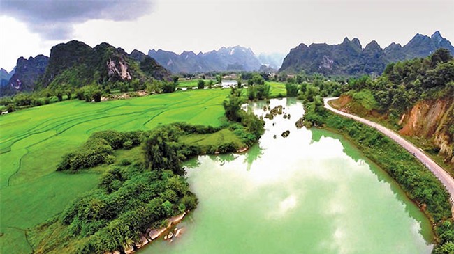 Phong cảnh quanh khu vực thác Bản Giốc, ruộng đồng và đường tỉnh lộ 206 đi vào thác. Ảnh: tuoitre