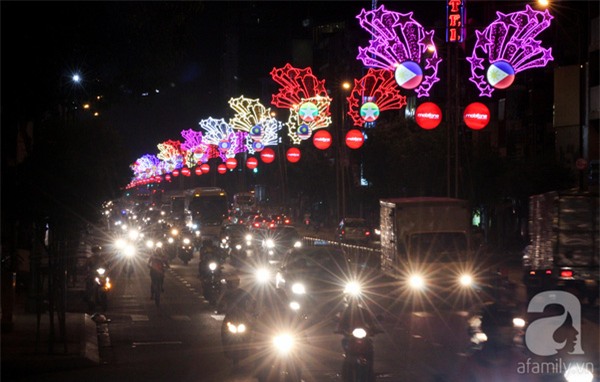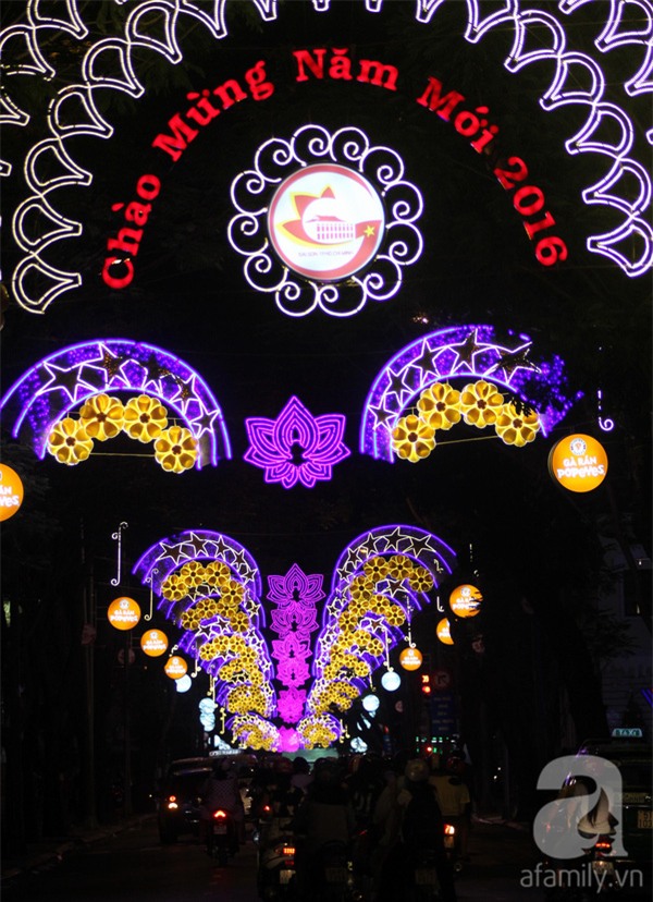 Nổi bật hơn cả là phố đi bộ Nguyễn Huệ, điểm nhấn của thành phố vừa được hoàn thành trong năm 2015. Cả con đường dài gần 2km được trang trí rực rỡ đèn hoa ở cả 4 làn đường cho xe máy và người đi bộ.