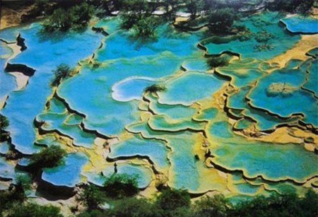 Những hồ nước nhỏ đẹp như tranh vẽ tại thung lũng Hoàng Long nhìn từ trên cao.
