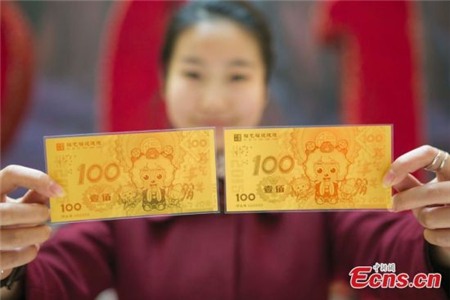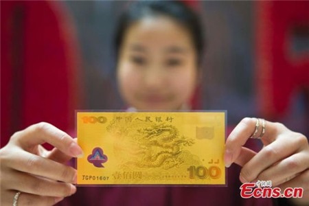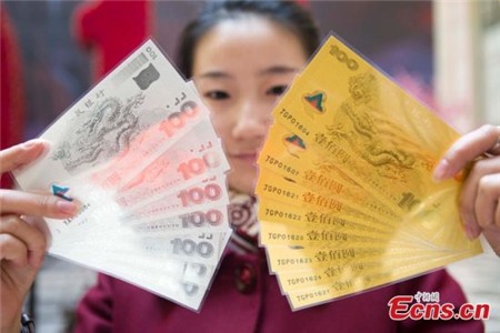 Dưới đây là hình ảnh những đồng tiền may mắn được các nhân viên tại một ngân hàng ở Trung Quốc giới thiệu. Chúng có mệnh giá 100NDT và in hình rồng, dê ngộ nghĩnh.