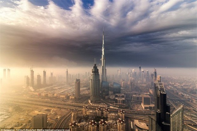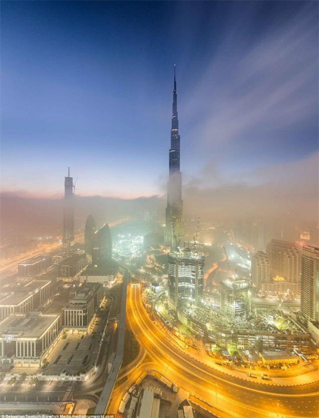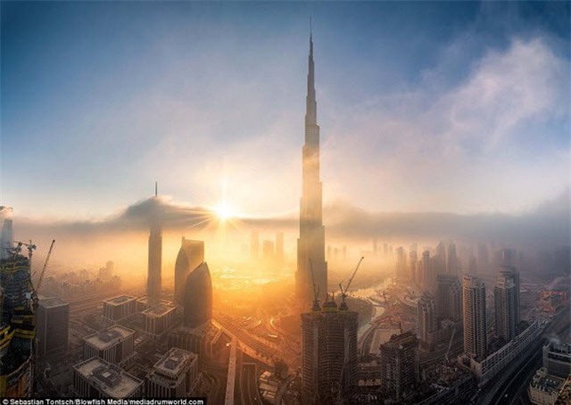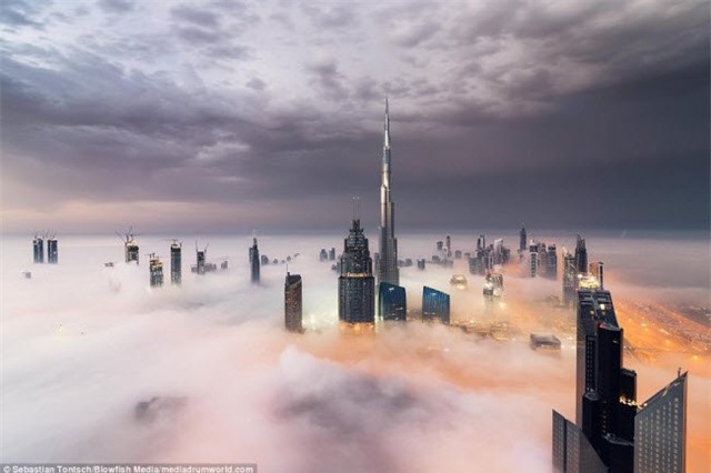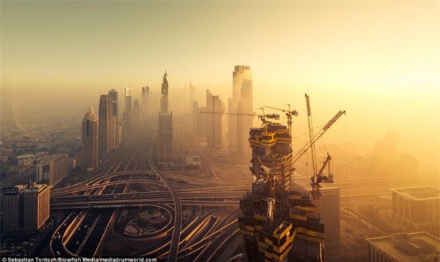 Nhiếp ảnh gia Sebastian Tontsch, 27 tuổi, đã lên đỉnh một tòa tháp cao 90 tầng tại Dubai để ghi lại cảnh tượng những tòa nhà chọc trời nhấp nhô trong màn sương sớm tại thành phố này.