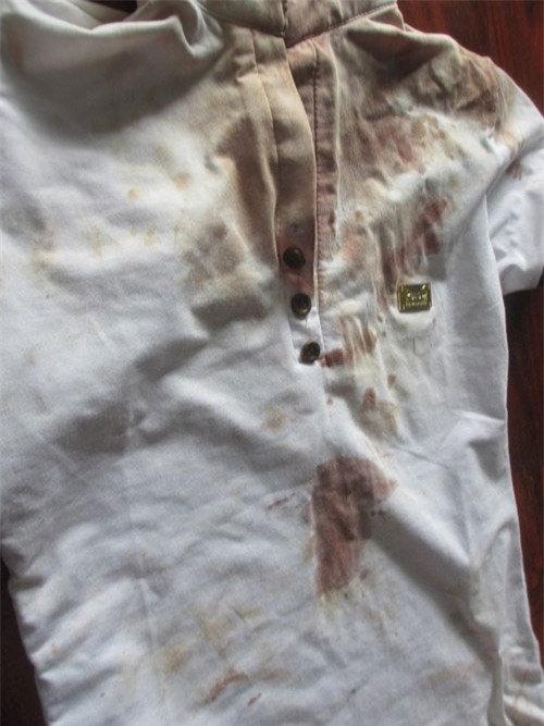 Chiếc áo trắng mà Nhi mặt hôm bị rạch mặt còn dính máu |
