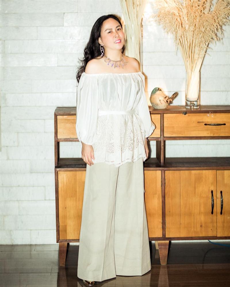 Mặc áo trễ vai nữ tính, tay bồng trendy nhưng lại có họa tiết hoa màu hồng hơi quê, Phượng Chanel còn chọn thêm quần nhung ống loe giúp outfit của cô hơi sến sẩm.