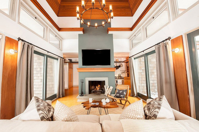 Không gian bao trùm là nét thân thiện, gần gũi của sắc màu và chất liệu gỗ. Những điểm nhấn màu nâu be nhạt từ ghế sofa, rèm cửa càng trở nên nổi bật dưới ánh sáng tự nhiên. Thêm vào đó là những điểm nhấn màu xanh của lò sưởi giả. Ánh sáng luôn là yếu tố vô cùng quan trọng để hoàn thiện bức tranh tổng thể.