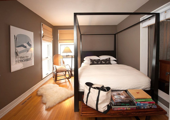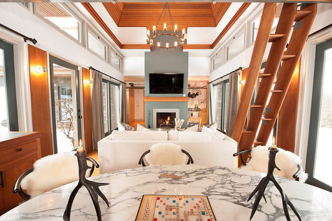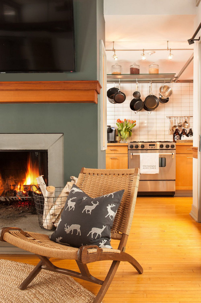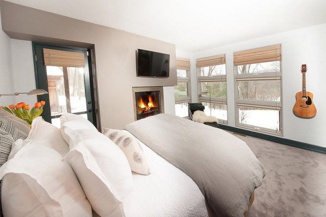 Lò sưởi cạnh cửa ra vào giúp không gian ngủ nghỉ luôn ấm áp trong mùa đông lạnh giá. Gần lò sưởi còn có một góc nhỏ để bố trí ghế ngồi thư giãn.
