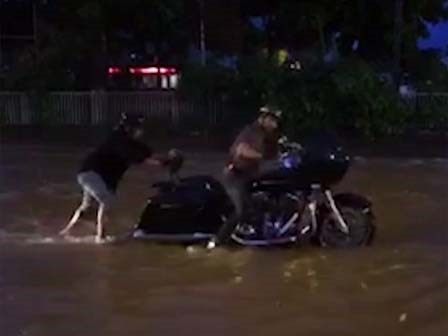 Đẩy môtô phân khối lớn chết máy trên đường ngập nặng